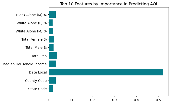 plt.title("Top 10 Features by Importance in Predicting AQI")Text(0.5, 1.0, 'Top 10 Features by Importance in Predicting AQI')