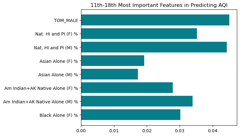 plt.title("11th-18th Most Important Features in Predicting AQI")Text(0.5, 1.0, '11th-18th Most Important Features in Predicting AQI')