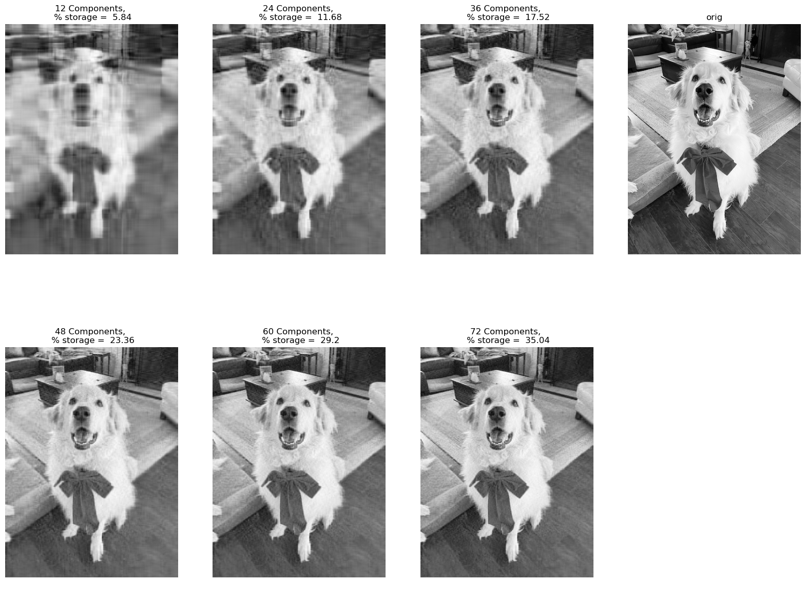 This blog post was pretty cool. I liked working with images and really visualizing the reconstructions in comparision to the original photo. It seems like there was not visible difference between our k = 72 image and our original. Storing this photo only takes 35% of the original storage space!